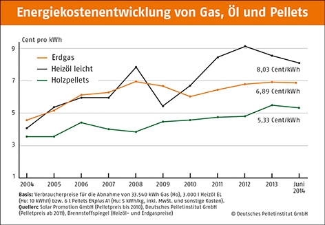 Das Heizen mit Erneuerbaren Energien schont also nicht nur die Umwelt, sondern auch den Geldbeutel: Holzpellets kosten derzeit etwa 40 Prozent weniger als die vergleichbare Menge Heizöl. Noch bedeutender als der momentane Preisvorteil ist jedoch der langfristige Kostenverlauf - schließlich betreibt man eine Heizung etwa 20 Jahre.